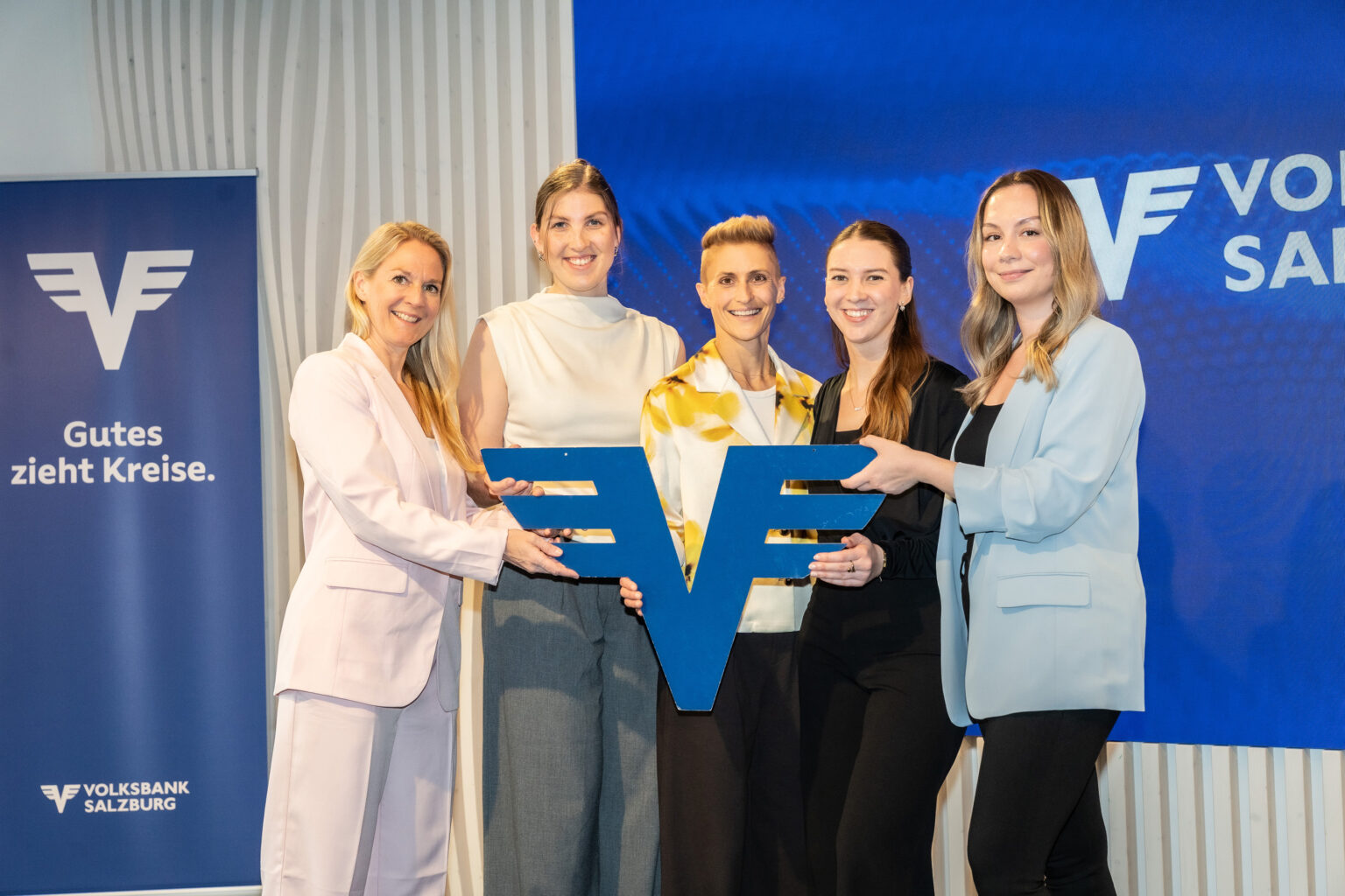 Pressebild 1: Skispringerin Eva Pinkelnig (Bildmitte) im Kreis der Volksbank Salzburg Mitarbeiterinnen Eva-Maria Köfler, Marie Sekanina, Elena Stein und Selma Mehinagic (v.l.n.r.).