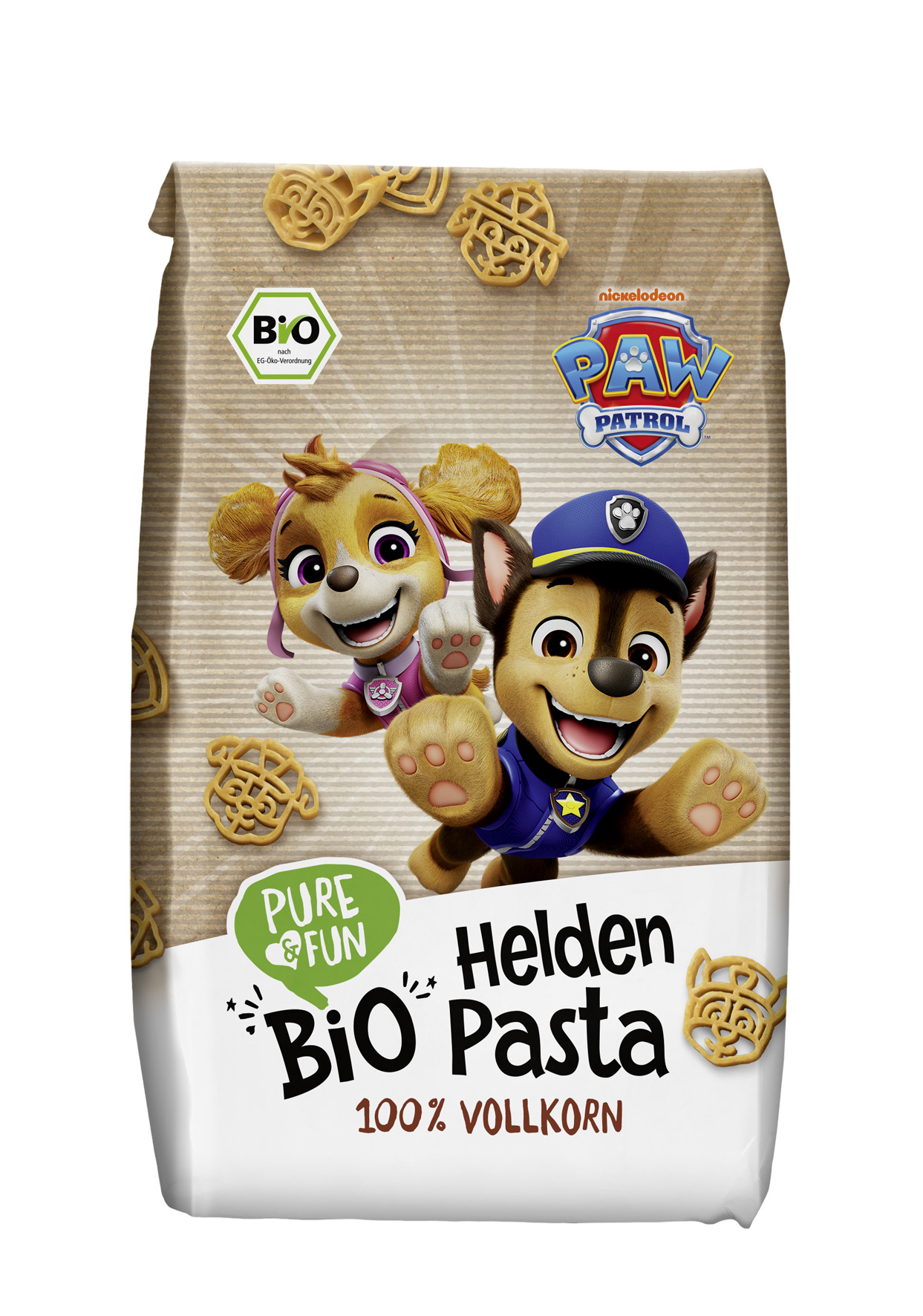 PURE&FUN hat ab sofort auch ein Produkt für die Hauptmahlzeit im Sortiment und deckt damit den Familienalltag ab. Die neue Pasta basiert zu 100 % auf Vollkorn-Hartweizengrieß aus biologischer Landwirtschaft und ist ballaststoffreich. Das Besondere: Die Nudeln kommen in Form der PAW Patrol Helden auf den Teller. UVP: € 2,49