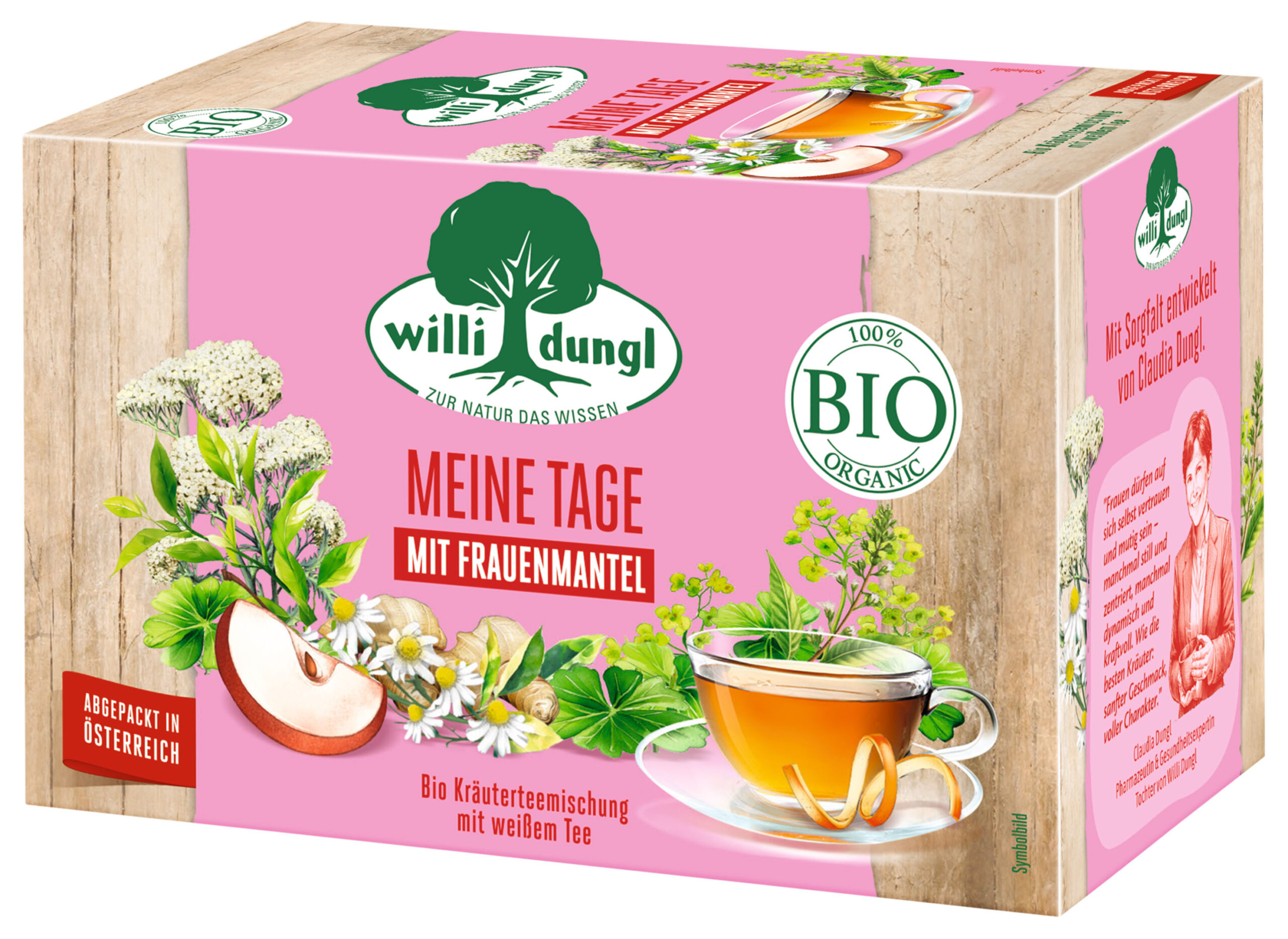 Auch für die Zeit der Menstruation, in all ihren Facetten, hat WILLI DUNGL ab sofort eine BIO-Teemischung im Sortiment, die auf einem ausgewogenen Kräutermix basiert. Frauenmantel, Schafgarbenblüten und Kamille verbinden sich bei Meine Tage mit der frischen Note von Zitronenverbene, sanftem weißen Tee, fruchtigem Apfel, würzigem Ingwer und zarten Orangenschalen. Die neue Sorte wird aus rein biologischen Zutaten hergestellt, überzeugt durch eine sanfte Kräuter- und feine Fruchtnote und sorgt für ein angenehmes Geschmackserlebnis.