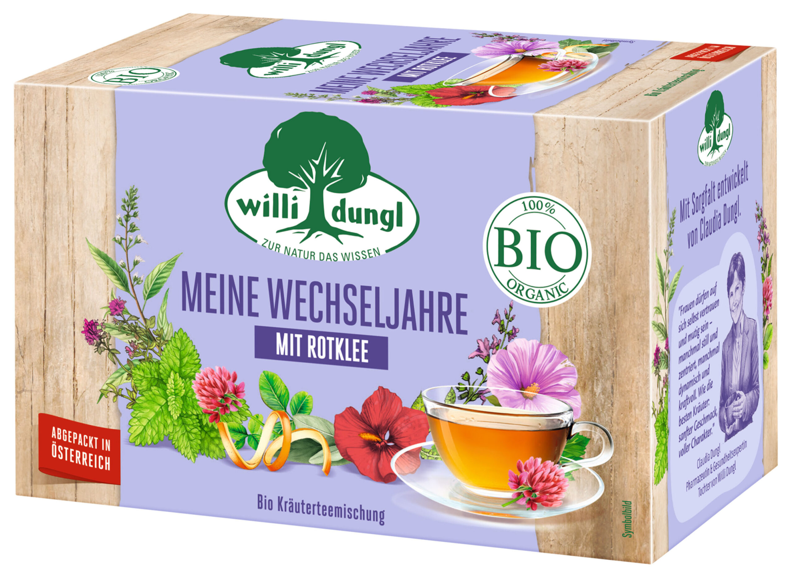 Die Wechseljahre sind körperlich und auch emotional eine Zeit des Wandels. Viele Frauen suchen in dieser Phase nach natürlicher Begleitung, um Balance und innere Ruhe zu bewahren. Genau hier setzt die jüngste Teekreation Meine Wechseljahre an. Herzstück der Mischung ist Rotklee, der mit seiner feinen, leicht nussigen Note für eine warme, runde Basis sorgt. Der kühlende Salbei sowie Thymian verleihen dem Tee eine aromatisch-würzige Tiefe, die durch die sanfte Milde der Käsepappel abgerundet wird. Pfefferminze und Zitronenverbene sorgen für eine angenehm frische Note und Hibiskus für die leuchtende Farbe. „Wir haben hier eine sanfte BIO-Kräutertee-Komposition zusammengestellt, die Genuss und Funktionalität verbindet und durch diese Zeit der Veränderung begleitet“, betont Claudia Dungl, Tochter von „Gesundheitspapst“ Willi Dungl. Sie verbindet bei der Entwicklung der Tees ihr fundiertes Kräuterheilkunde-Wissen mit ihrer Expertise als Pharmazeutin.