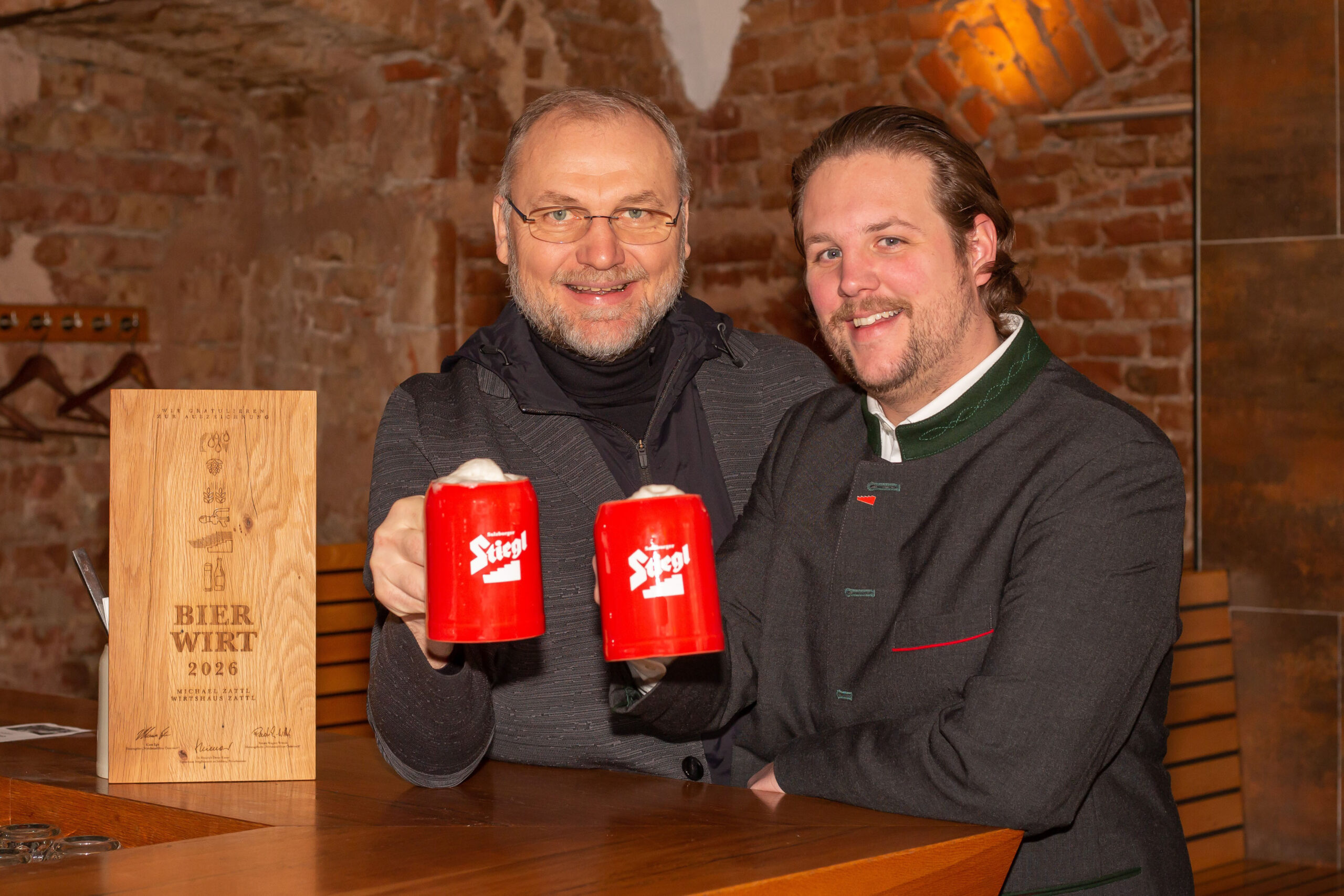 Pressebild: Der neue „Wirtshausführer Bierwirt des Jahres“ in Wien heißt Michael Zattl (li) – überreicht wurde die Auszeichnung von Stiegl-Bierversilberer Peter Ruzicka.